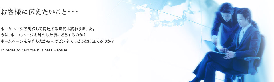 まずは、このホームページを見て頂きありがとうございます。このページを見て頂いているという事は、少なからずホームページを新規に立ち上げようと考えておられるか?ホームページのリニューアルを検討されているか?何らかの状況によりホームページ作成業者をお捜しになっておられるのではないかと思います。
